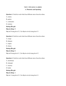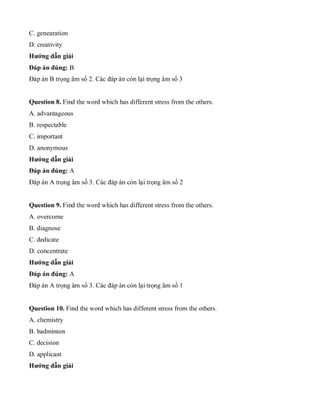 Question 8. Find the word which has different stress from the others. A. advantageous B. respectable C. important D. anonymous Hướng dẫn giải Đáp án đúng: A