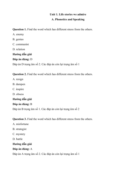 Question 1. Find the word which has different stress from the others. A. enemy B. genius C. communist D. relation Hướng dẫn giải Đáp án đúng: D