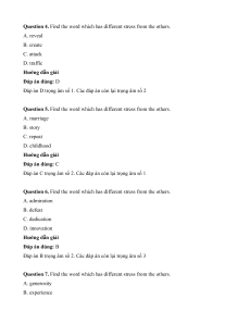 Question 5. Find the word which has different stress from the others. A. marriage B. story C. repeat D. childhood Hướng dẫn giải Đáp án đúng: C