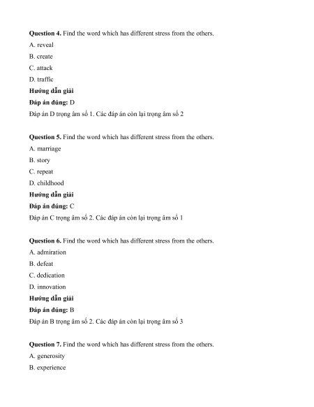 Question 4. Find the word which has different stress from the others. A. reveal B. create C. attack D. traffic Hướng dẫn giải Đáp án đúng: D