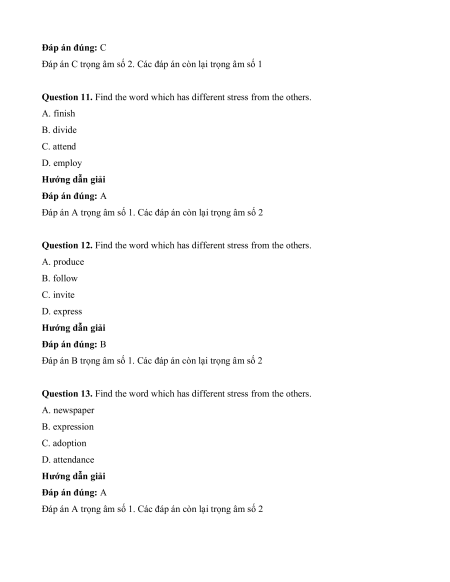 Question 11. Find the word which has different stress from the others. A. finish B. divide C. attend D. employ Hướng dẫn giải Đáp án đúng: A