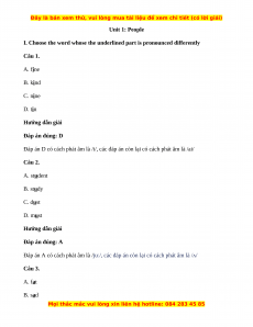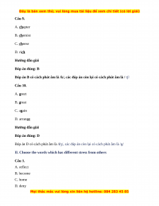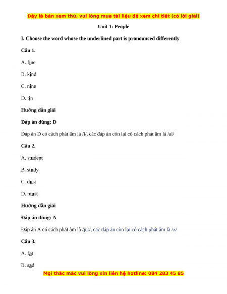 I. Choose the word whose the underlined part is pronounced differently Câu 1. A. fine B. kind C. nine D. tin Hướng dẫn giải