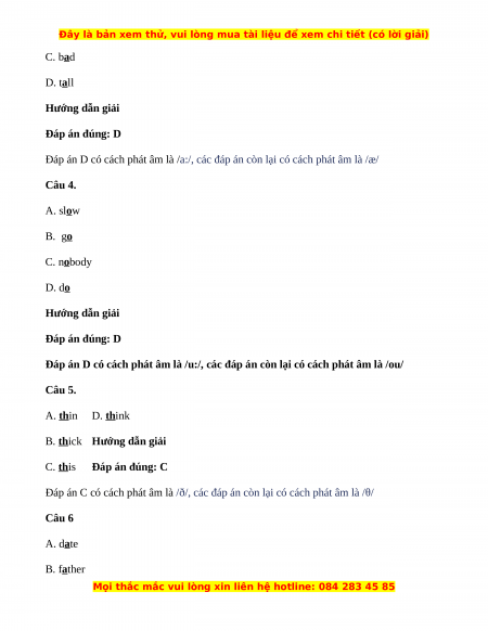 Đáp án D có cách phát âm là /a:/, các đáp án còn lại có cách phát âm là /æ/ Câu 4. A. slow B. go C. nobody D. do Hướng dẫn giải Đáp án đúng: D