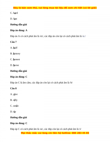 Đáp án A có cách phát âm là /ei/, các đáp án còn lại có cách phát âm là /ɑː/ Câu 7 A. half B. history C. honest D. horse Hướng dẫn giải Đáp án đúng: C