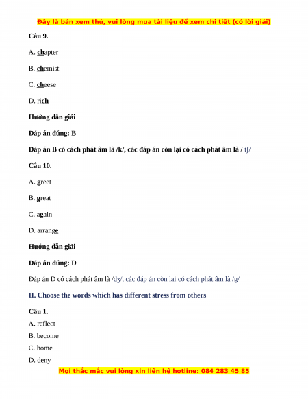 II. Choose the words which has different stress from others Câu 1. A. reflect B. become C. home D. deny