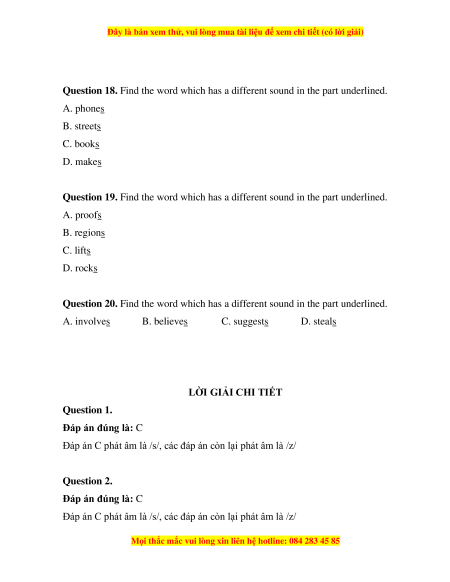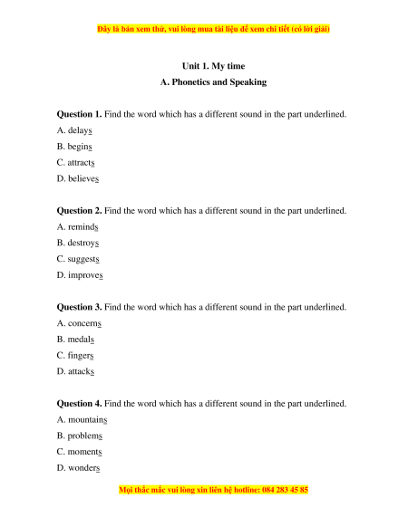 Question 1. Find the word which has a different sound in the part underlined. A. delays B. begins C. attracts D. believes