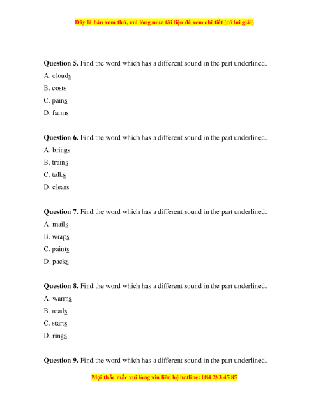 Question 5. Find the word which has a different sound in the part underlined. A. clouds B. costs C. pains D. farms