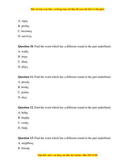 Question 10. Find the word which has a different sound in the part underlined. A. walks B. steps C. shuts D. plays