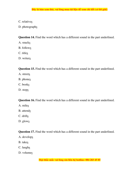 Question 14. Find the word which has a different sound in the part underlined. A. snacks B. follows C. titles D. writers