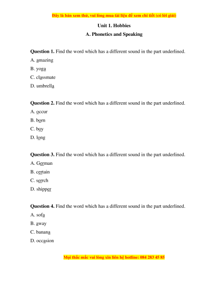 Question 4. Find the word which has a different sound in the part underlined. A. sofa B. away C. banana D. occasion