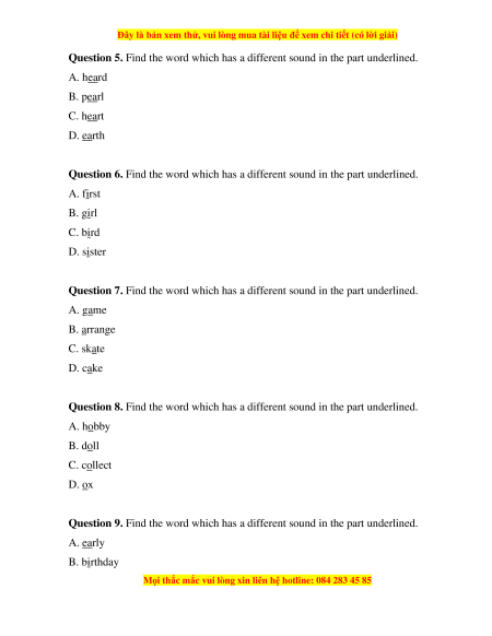 Question 5. Find the word which has a different sound in the part underlined. A. heard B. pearl C. heart D. earth