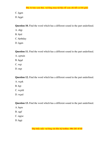 Question 13. Find the word which has a different sound in the part underlined. A. born B. surf C. nurse D. hurt