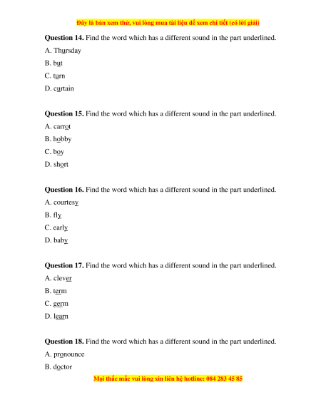 Question 14. Find the word which has a different sound in the part underlined. A. Thursday B. but C. turn D. curtain