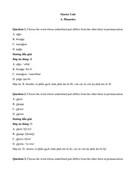 Question 1. Choose the word whose underlined part differs from the other three in pronunciation. A. ethic B. breathe C. marathon D. paths Hướng dẫn giải