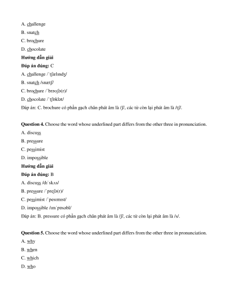 Đáp án đúng: C A. challenge /ˈtʃælɪndʒ/ B. snatch /snætʃ/ C. brochure /ˈbrəʊʃə(r)/ D. chocolate /ˈtʃɒklət/