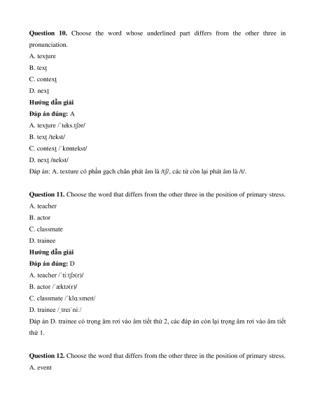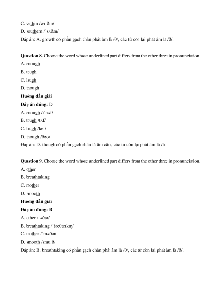 Question 9. Choose the word whose underlined part differs from the other three in pronunciation. A. other B. breathtaking C. mother D. smooth Hướng dẫn giải Đáp án đúng: B A. other /ˈʌðər/