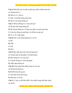 Câu 1. Thông tin khi đưa vào máy tính, chúng đều được biến đổi thành dạng chung đó là: A. Văn bản. B. Âm thanh. C. Hình ảnh. D. Dãy bit.