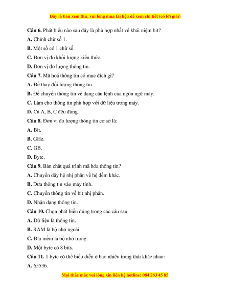 Câu 6. Phát biểu nào sau đây là phù hợp nhất về khái niệm bit?