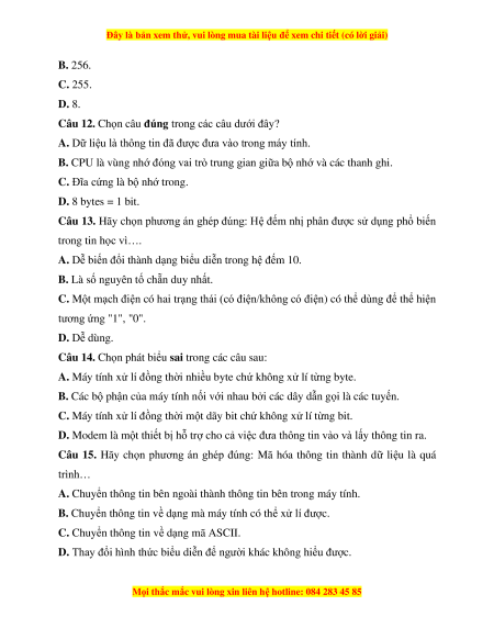 Câu 11. 1 byte có thể biểu diễn ở bao nhiêu trạng thái khác nhau: A. 65536.