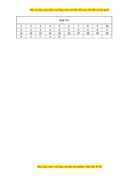 ĐÁP ÁN 1 2 3 4 5 6 7 8 9 10 D A B A D D D A B D 11 12 13 14 15 16 17 18 19 20 B A C A B