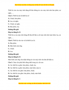 Câu 3. Thiết bị nào là thiết bị ra? A. Chuột, bàn phím. B. Loa, tai nghe. C. Chuột, tai nghe. D. Bàn phím, loa. Hướng dẫn giải Đáp án đúng là: B