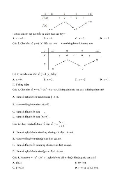 Giá trị cực đại của hàm số y f x bằng A. x 0 . B. x 2 . C. y 3 . D. y 1. II. Thông hiểu Câu 6. Cho hàm số 3 2