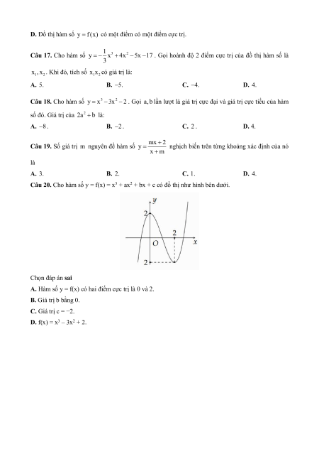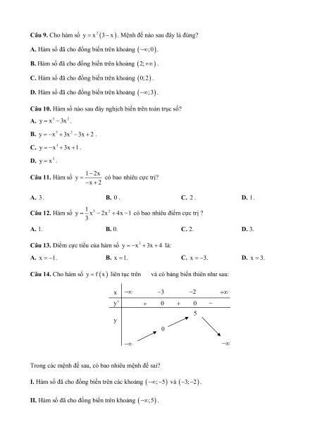 y x 3x 1 nghịch biến khi x thuộc khoảng nào sau đây? A. (0;2). B. (0;). C. ( ; 2). D. ( ; 0) và (2;). Câu 9. Cho hàm số 2