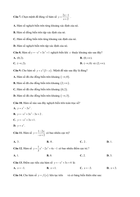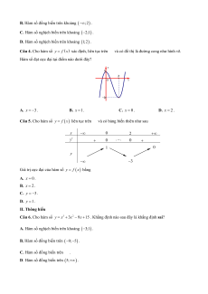 y x 3x 1 nghịch biến khi x thuộc khoảng nào sau đây? A. (0;2). B. (0;). C. ( ; 2). D. ( ; 0) và (2;). Câu 9. Cho hàm số 2
