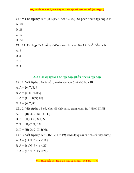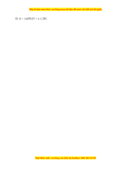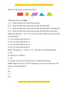 Câu 1. Viết tập hợp A các số tự nhiên lớn hơn 5 và nhỏ hơn 10. A. A = {6; 7; 8; 9}. B. A = {5; 6; 7; 8; 9}. C. A = {6; 7; 8; 9; 10}. D. A = {6; 7; 8}.