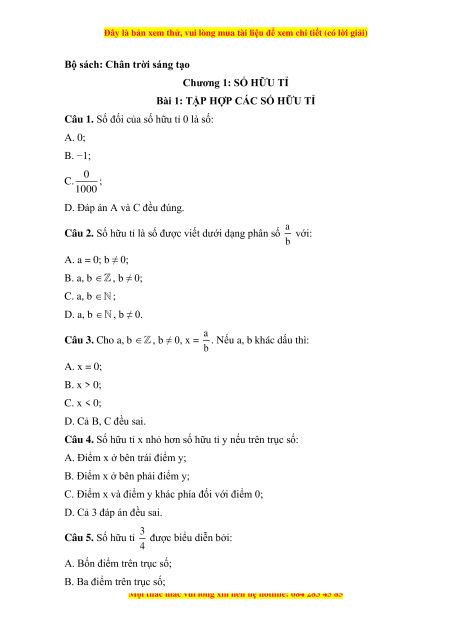 Câu 1. Số đối của số hữu tỉ 0 là số: A. 0; B. −1; 0 C. ; 1000