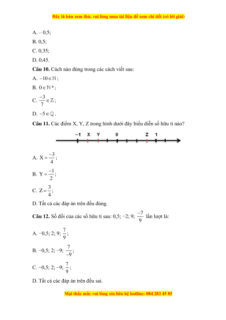 Câu 12. Số đối của các số hữu tỉ sau: 0,5; −2; 9; lần lượt là: 9 7 A. −0,5; 2; 9; ; 9 7 B. −0,5; 2; −9; ; − 9 7 C. −0,5; 2; −9; ; 9