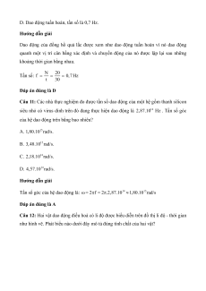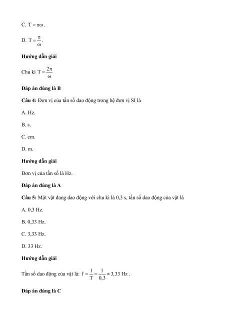 Câu 5: Một vật đang dao động với chu kì là 0,3 s, tần số dao động của vật là A. 0,3 Hz. B. 0,33 Hz. C. 3,33 Hz. D. 33 Hz. Hướng dẫn giải