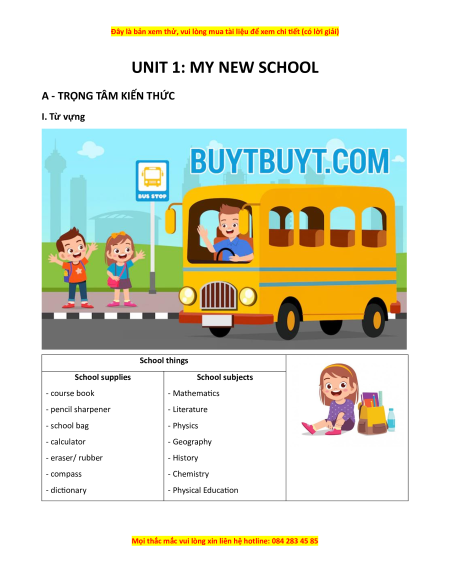 A - TRỌNG TÂM KIẾN THỨC I. Từ vựng School things School supplies School subjects - course book - Mathematics - pencil sharpener - Literature - school bag - Physics - calculator - Geography - eraser/ rubber - History - compass - Chemistry - dictionary - Physical Education