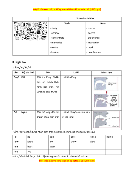School activities Verb Noun - study - course - achieve - degree - concentrate - experience - memorise - instruction - revise - mark - look up - qualification II. Ngữ âm