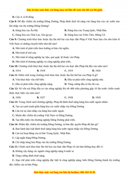 Câu 8: Để độc chiếm thị trường Đông Dương, Pháp đánh thuế rất nặng vào hàng hóa của các nước nào