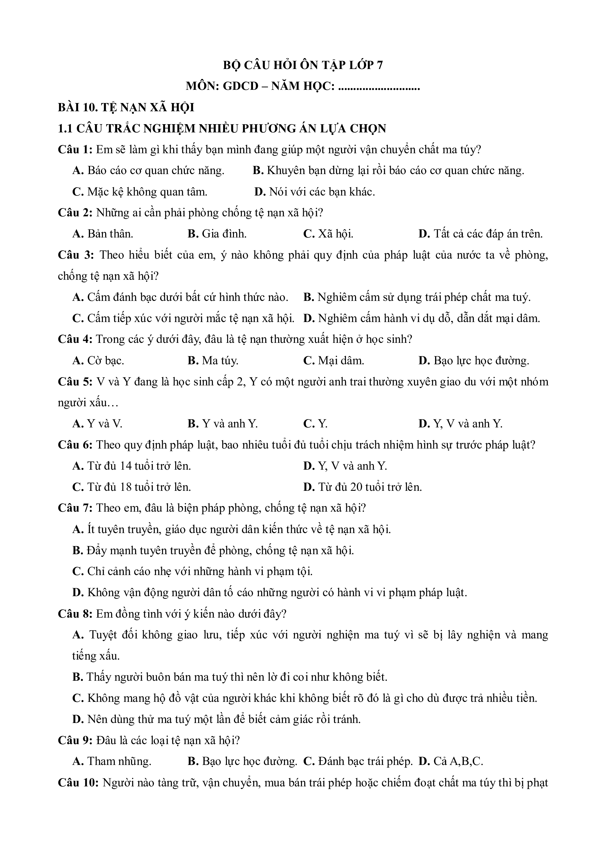 - Tailieugiaovien.com.vn giới thiệu Câu hỏi ôn tập + Đề kiểm tra GDCD 7 theo Bài học (chung cho ba sách) BÀI 10. TỆ NẠN XÃ HỘI
