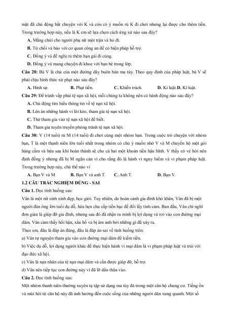 Câu 30: V (14 tuổi) rủ M (14 tuổi) đi chơi cùng một nhóm bạn. Trong cuộc trò chuyện với nhóm