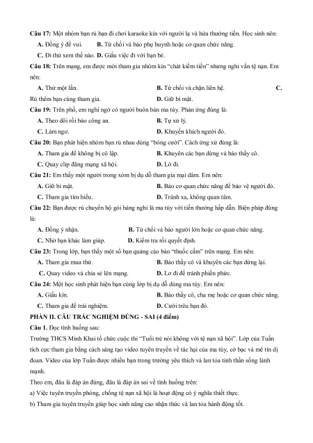 Câu 24: Một học sinh phát hiện bạn cùng lớp bị dụ dỗ dùng ma túy. Em nên: A. Giấu kín.
