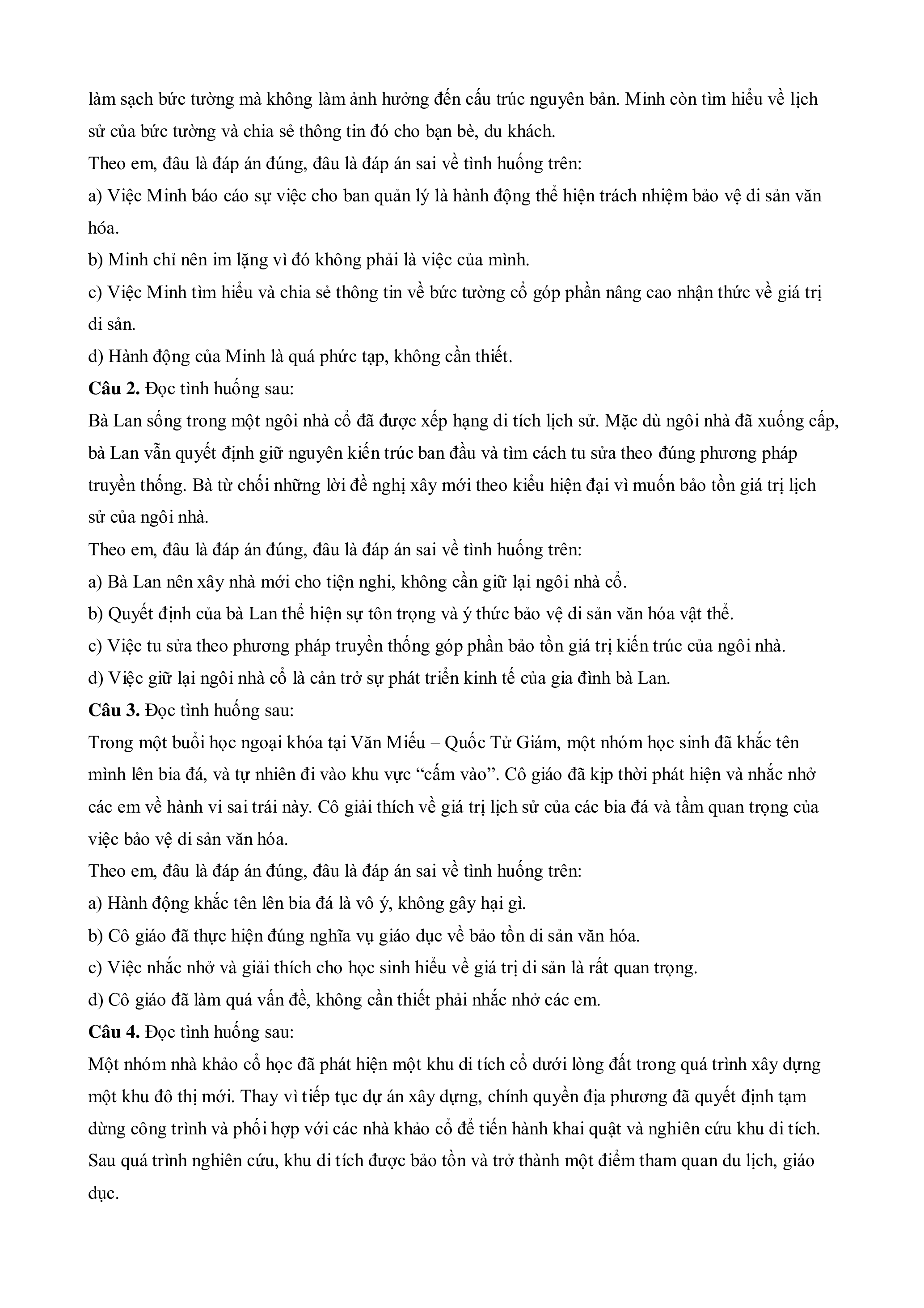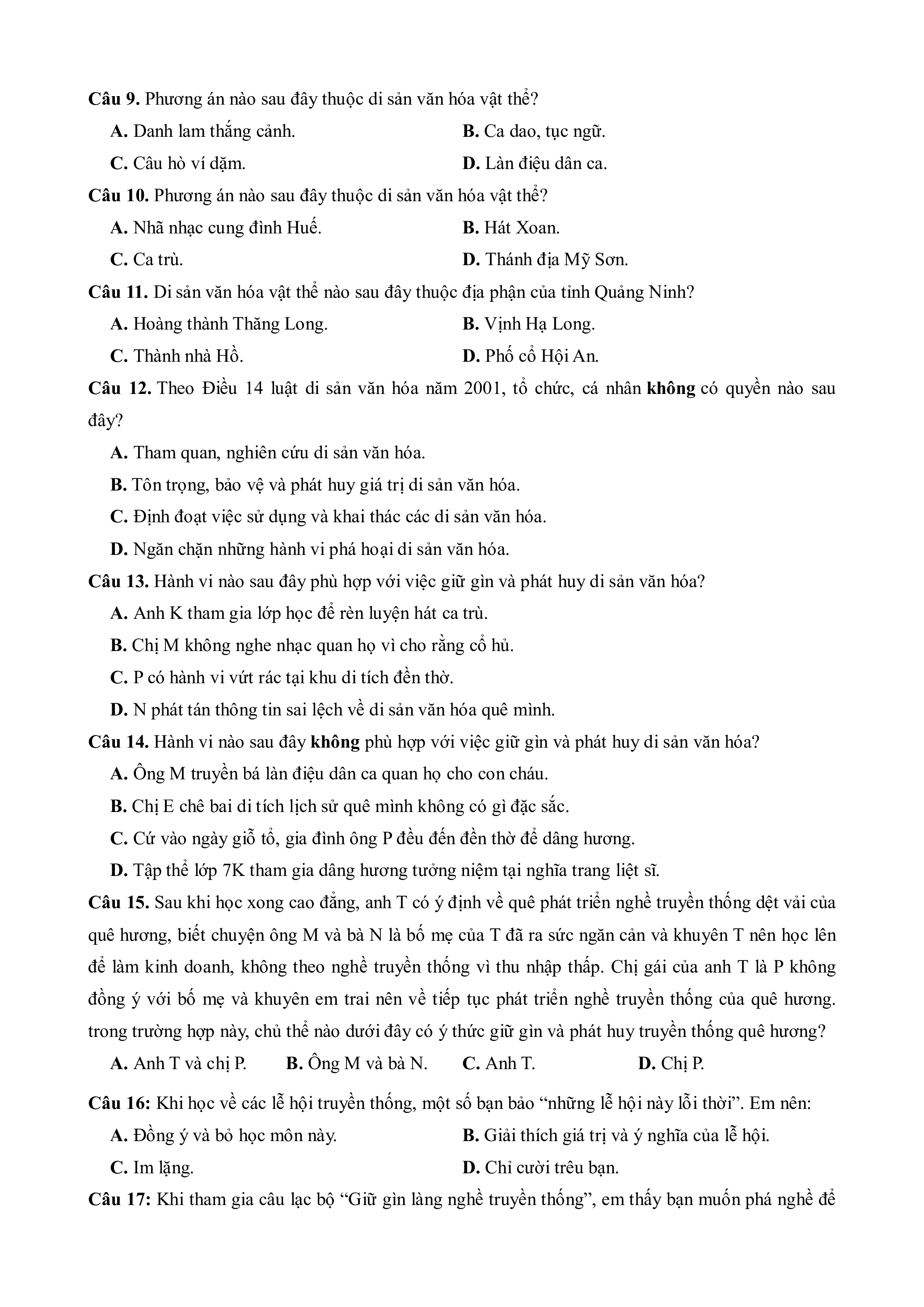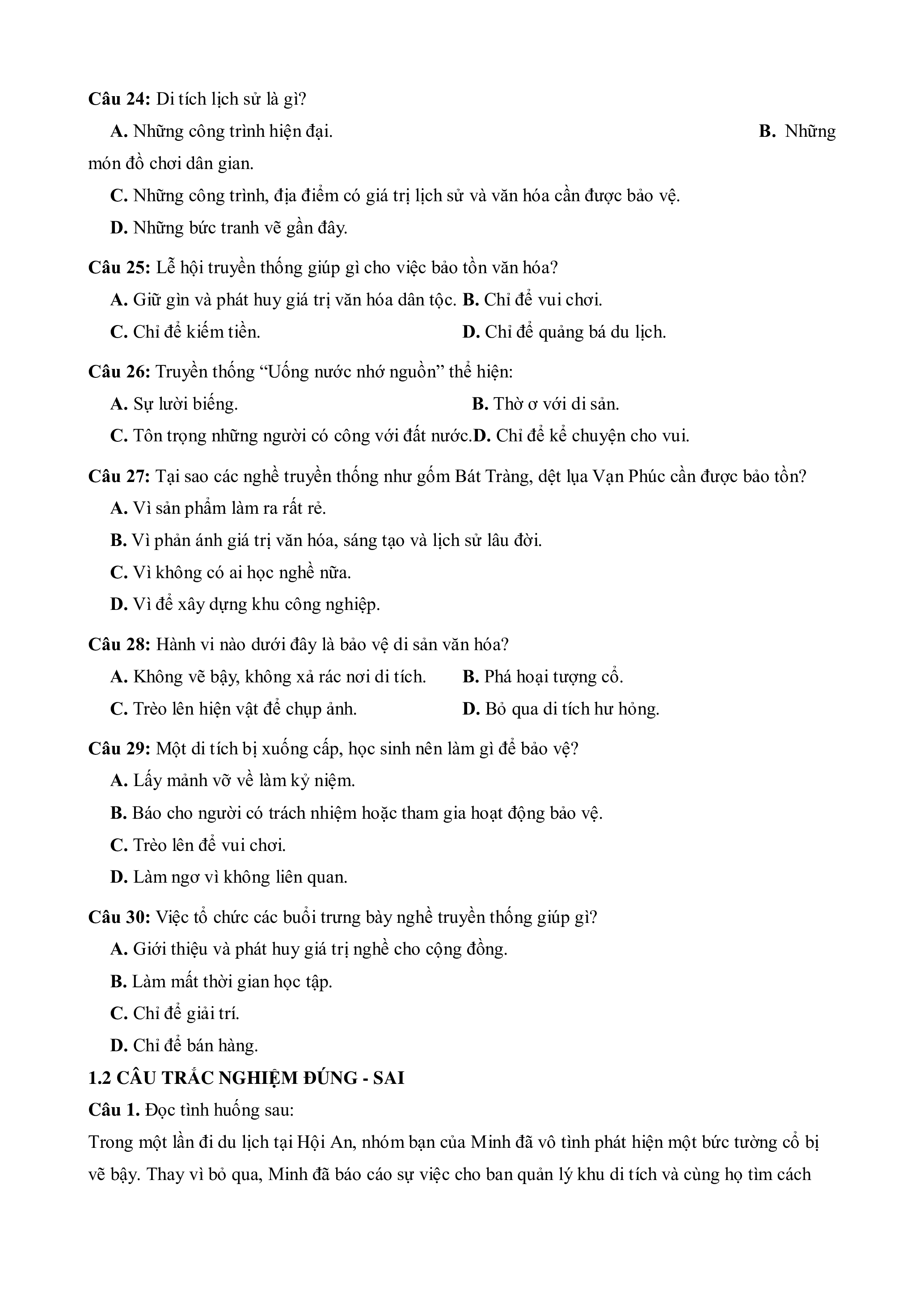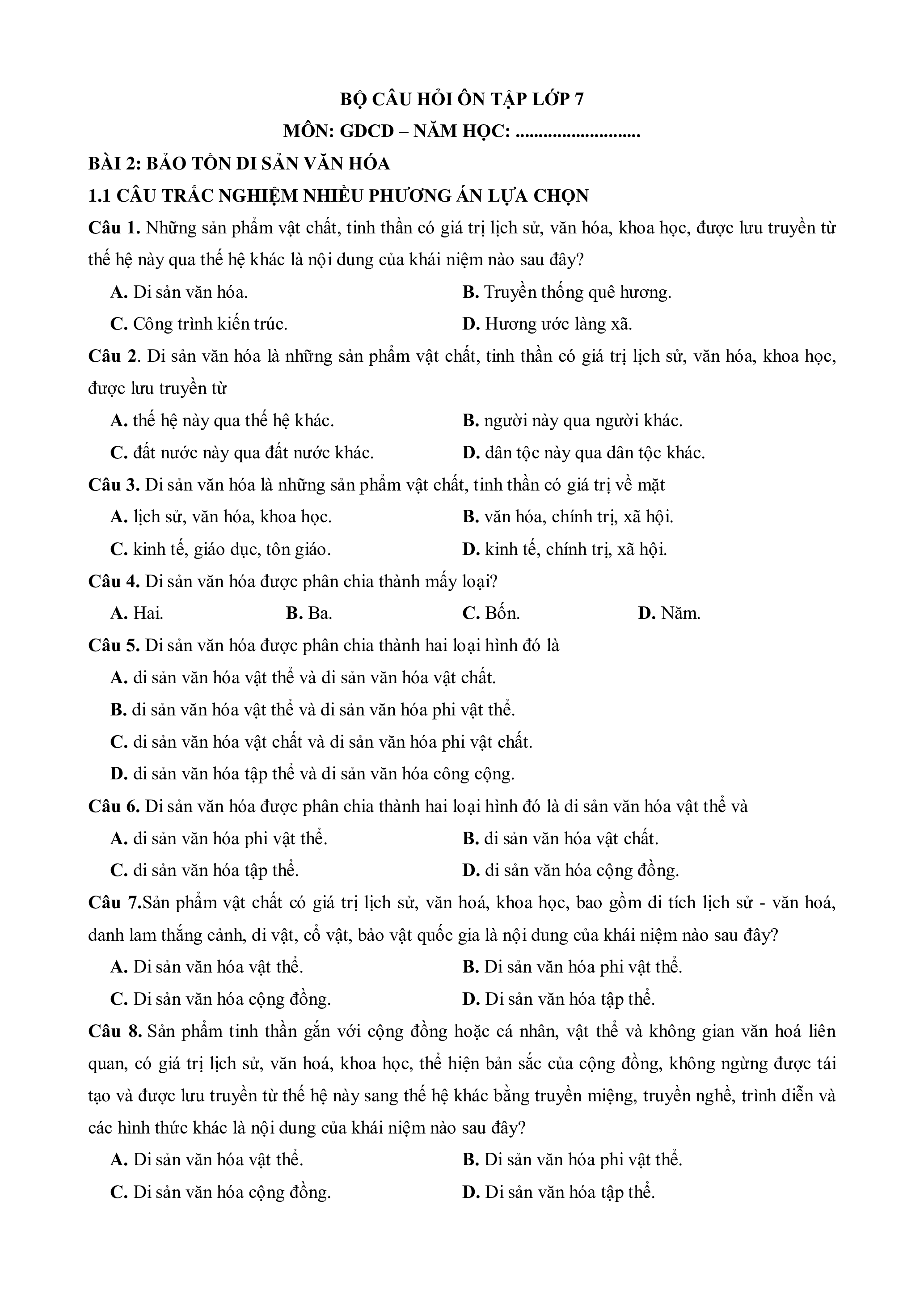 - Tailieugiaovien.com.vn giới thiệu Câu hỏi ôn tập + Đề kiểm tra GDCD 7 theo Bài học (chung cho ba sách) BÀI 2. BẢO TỒN DI SẢN VĂN HÓA