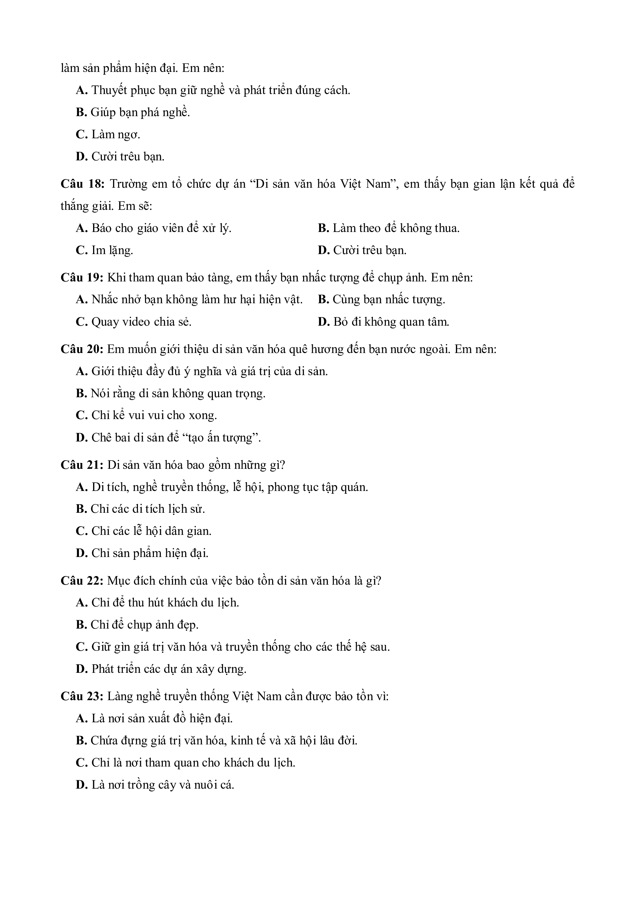 Câu 18: Trường em tổ chức dự án “Di sản văn hóa Việt Nam”, em thấy bạn gian lận kết quả để thắng giải. Em sẽ: