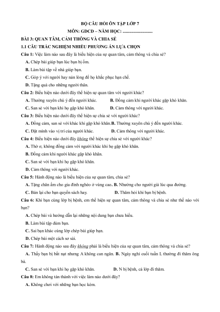 - Tailieugiaovien.com.vn giới thiệu Câu hỏi ôn tập + Đề kiểm tra GDCD 7 theo Bài học (chung cho ba sách) BÀI 3. QUAN TÂM, CẢM THÔNG VÀ CHIA SẺ
