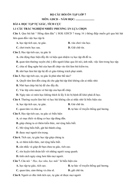 - Tailieugiaovien.com.vn giới thiệu Câu hỏi ôn tập + Đề kiểm tra GDCD 7 theo Bài học (chung cho ba sách) BÀI 4. HỌC TẬP TỰ GIÁC, TÍCH CỰC