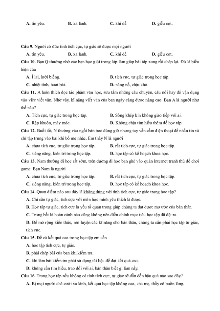 Câu 9. Người có đức tính tích cực, tự giác sẽ được mọi người A. tin yêu. B. xa lánh. C. khi dễ. D. giễu cợt.