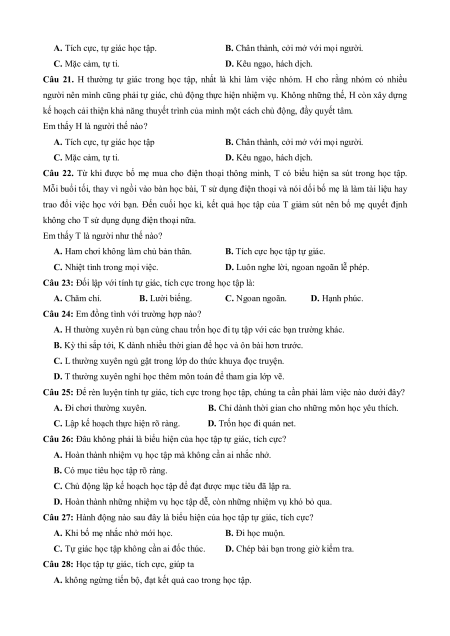 Câu 23: Đối lập với tính tự giác, tích cực trong học tập là: A. Chăm chỉ. B. Lười biếng. C. Ngoan ngoãn. D. Hạnh phúc.