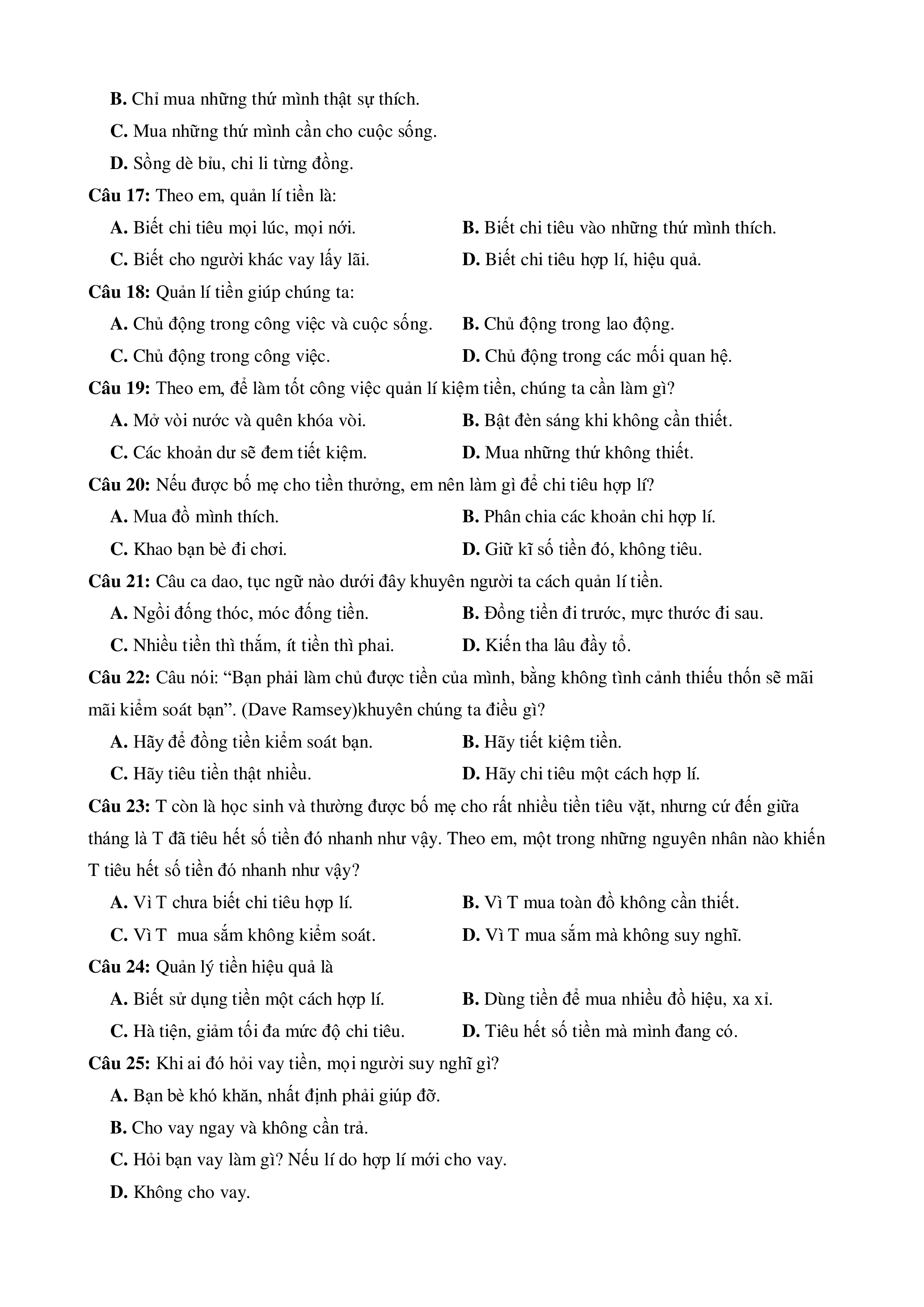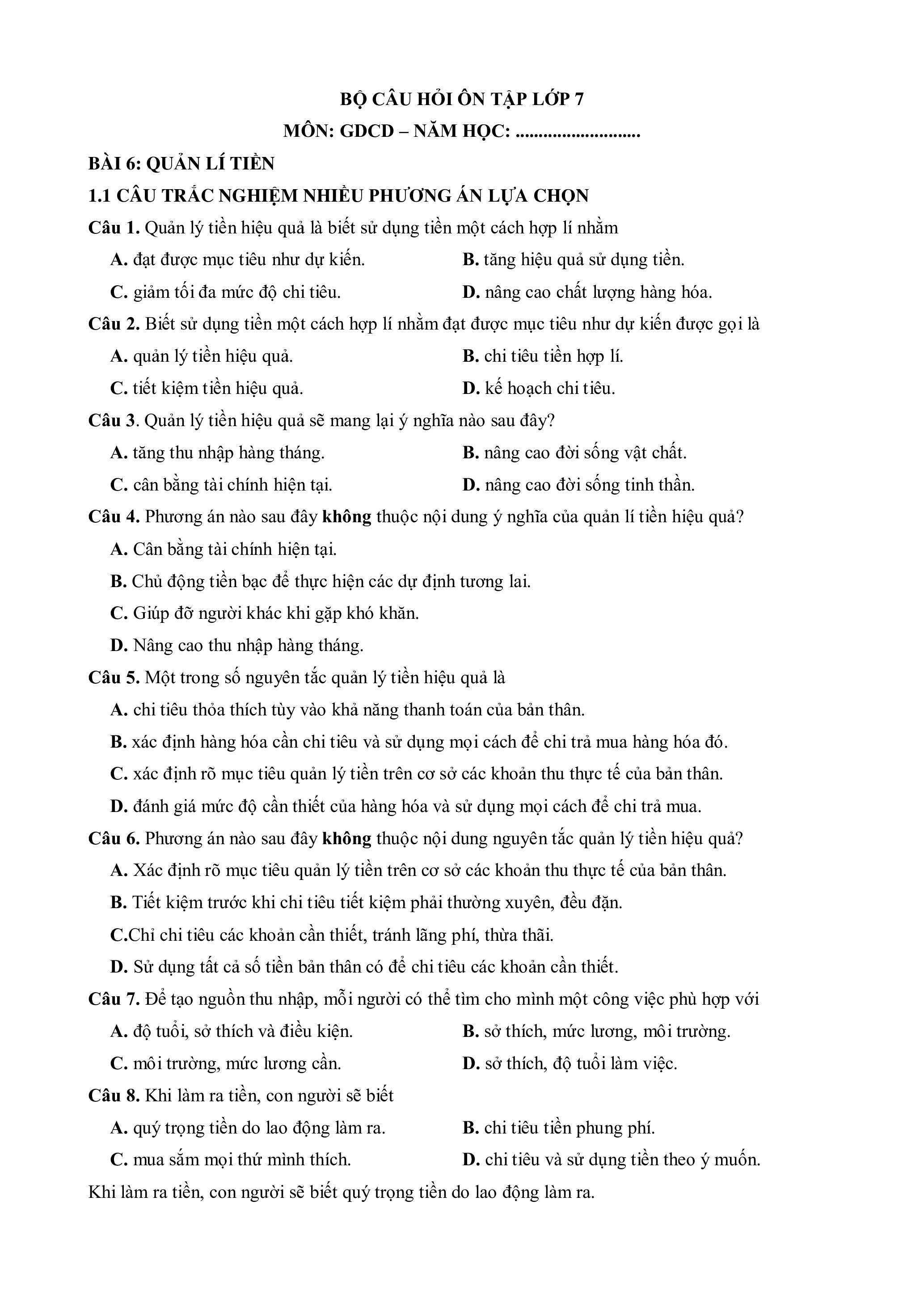 - Tailieugiaovien.com.vn giới thiệu Câu hỏi ôn tập + Đề kiểm tra GDCD 7 theo Bài học (chung cho ba sách) BÀI 6. QUẢN LÍ TIỀN