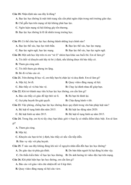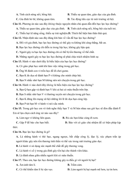 Câu 17. Theo em, bạo lực học đường không gây ra điều gì với người bị hại? A. Ám ảnh tâm lí. B. Trầm cảm.