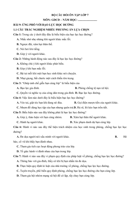 - Tailieugiaovien.com.vn giới thiệu Câu hỏi ôn tập + Đề kiểm tra GDCD 7 theo Bài học (chung cho ba sách) BÀI 9. ỨNG PHÓ VỚI BẠO LỰC HỌC ĐƯỜNG