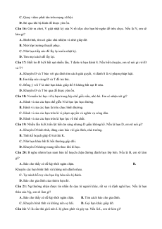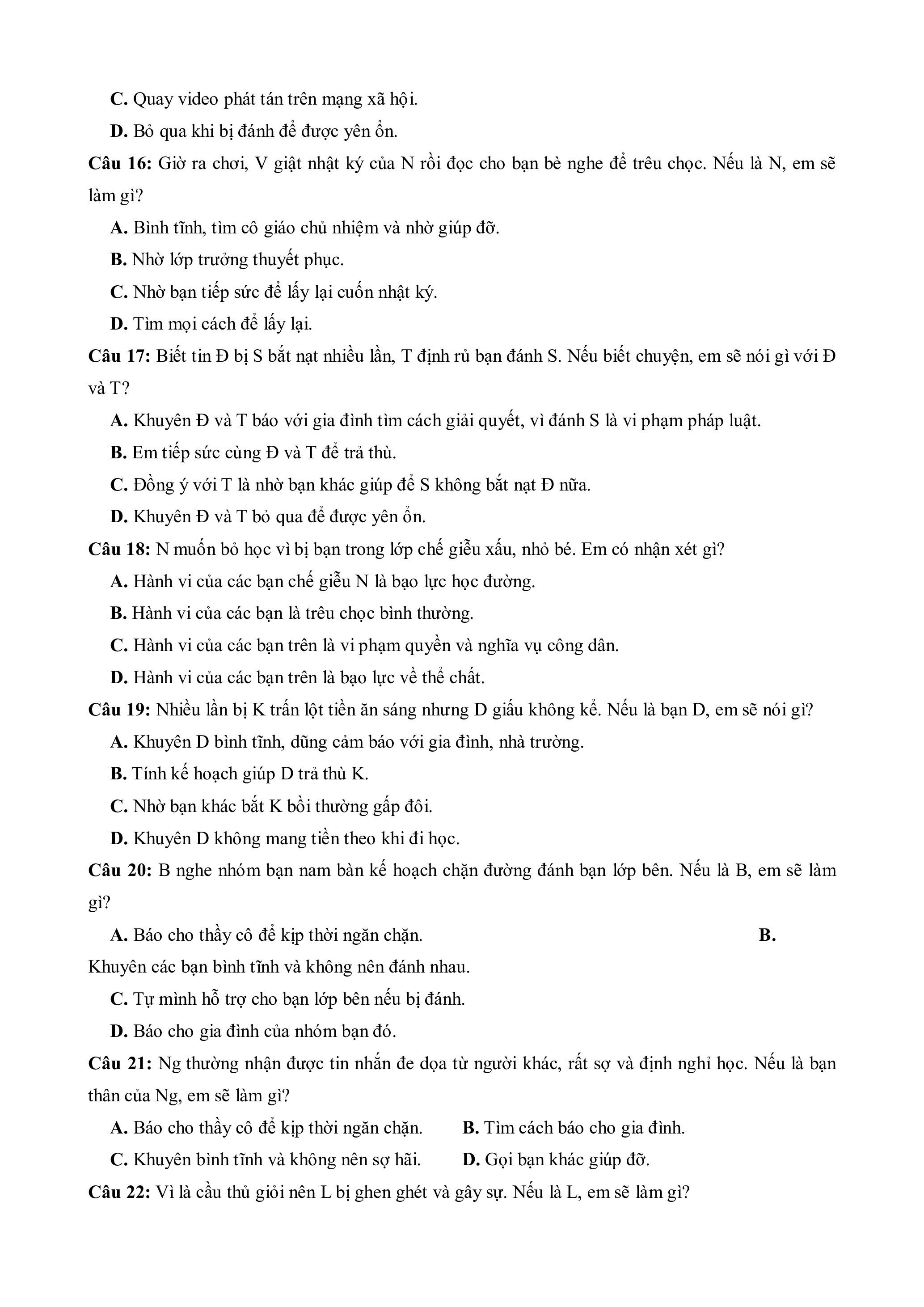 Câu 20: B nghe nhóm bạn nam bàn kế hoạch chặn đường đánh bạn lớp bên. Nếu là B, em sẽ làm gì?