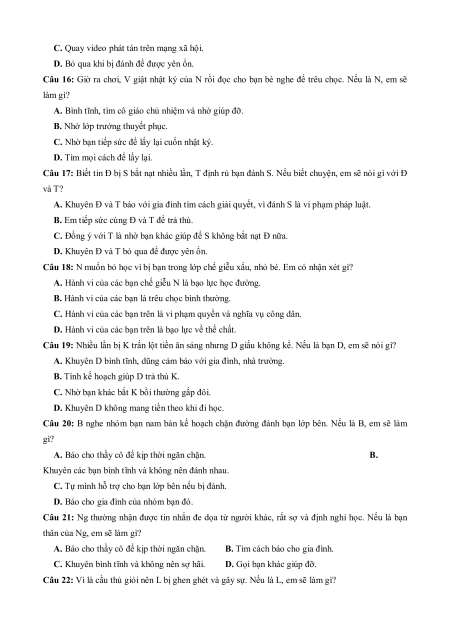 Câu 21: Ng thường nhận được tin nhắn đe dọa từ người khác, rất sợ và định nghỉ học. Nếu là bạn
