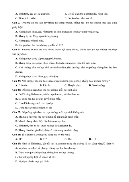 Câu 25: Nhà trường, cha mẹ học sinh có trách nhiệm gì để phòng, chống bạo lực học đường? A. Giáo dục. B. Răn đe. C. Thuyết phục. D. Nuôi dưỡng.